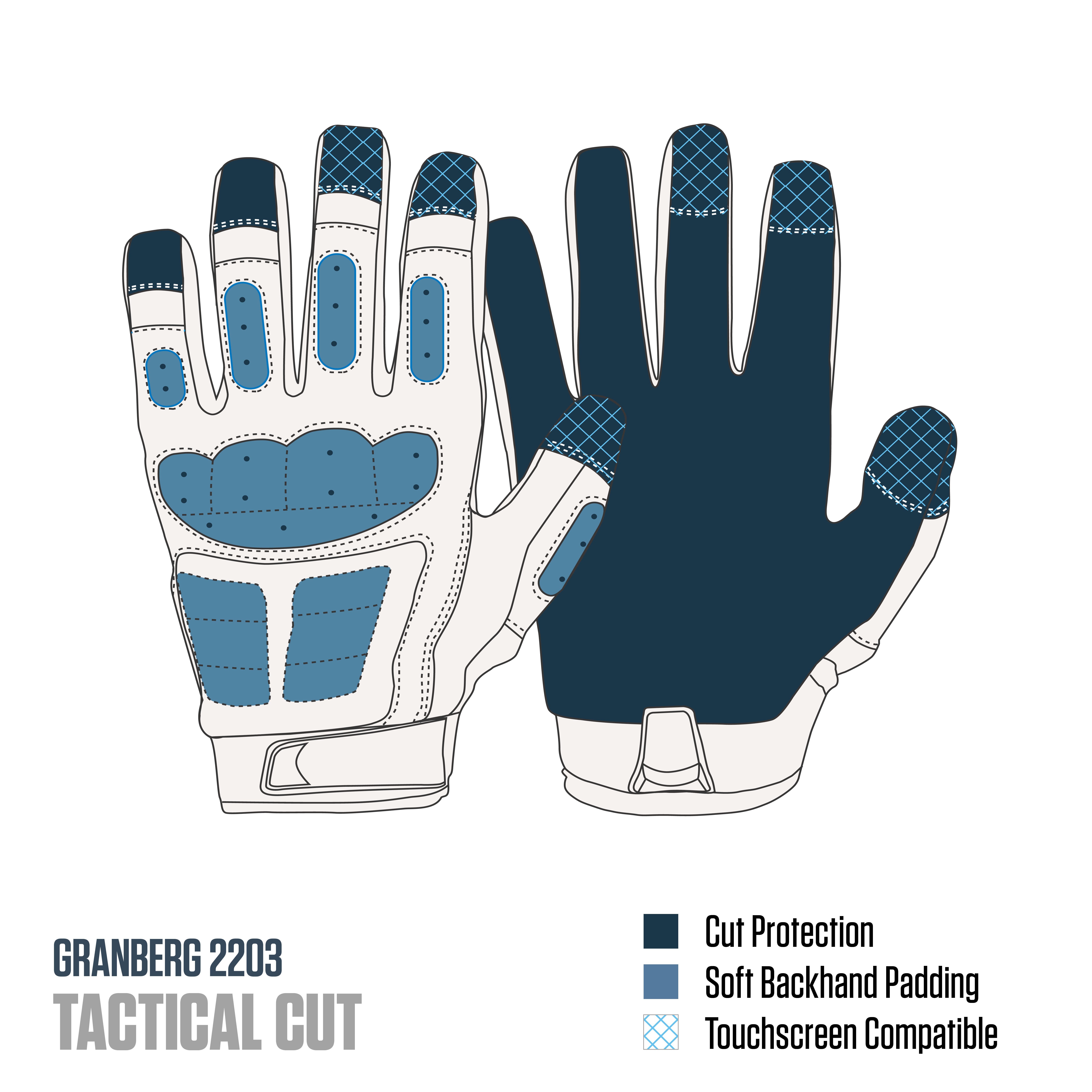 GRANBERG 2203 TACTICAL CUT delivers reliable Level C cut protection through a full Kevlar® lining in the palm, while offering excellent dexterity with premium goatskin leather. Touchscreen compatible fingertips ensure seamless interaction with devices without compromising performance. With the soft back of hand padding they form a highly adaptive defensive barrier, quickly conforming to the hands for critical protection against laceration hazards, friction injuries, and light impact in tight spaces.