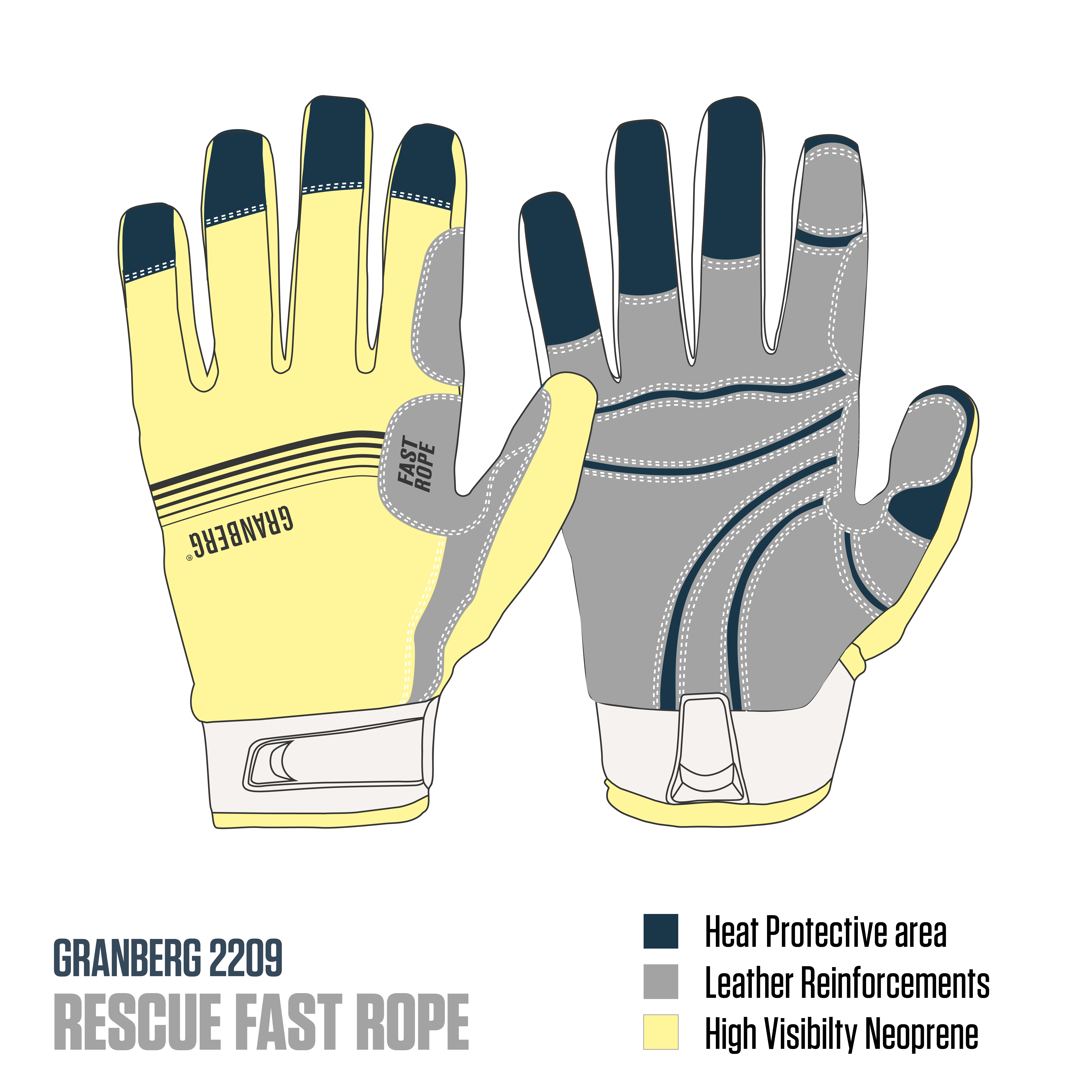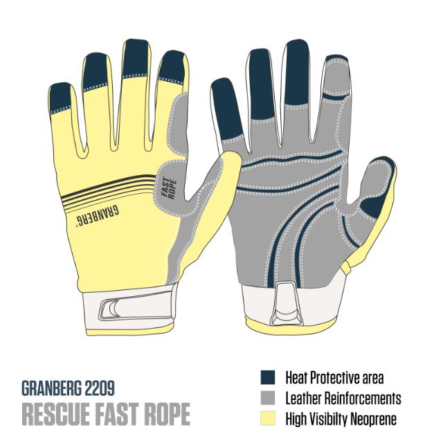 Engineered for ultimate operational survivability, GRANBERG 2209 RESCUE FAST ROPE gloves offer certified Contact Heat Level 2 protection, combined with extreme abrasion resistance through reinforced palms. Their ergonomic tight fit and pre-bent fingers provide superior dexterity for fast-rope maneuvers and rescue operations, where heat and tear resistance are mission-critical.